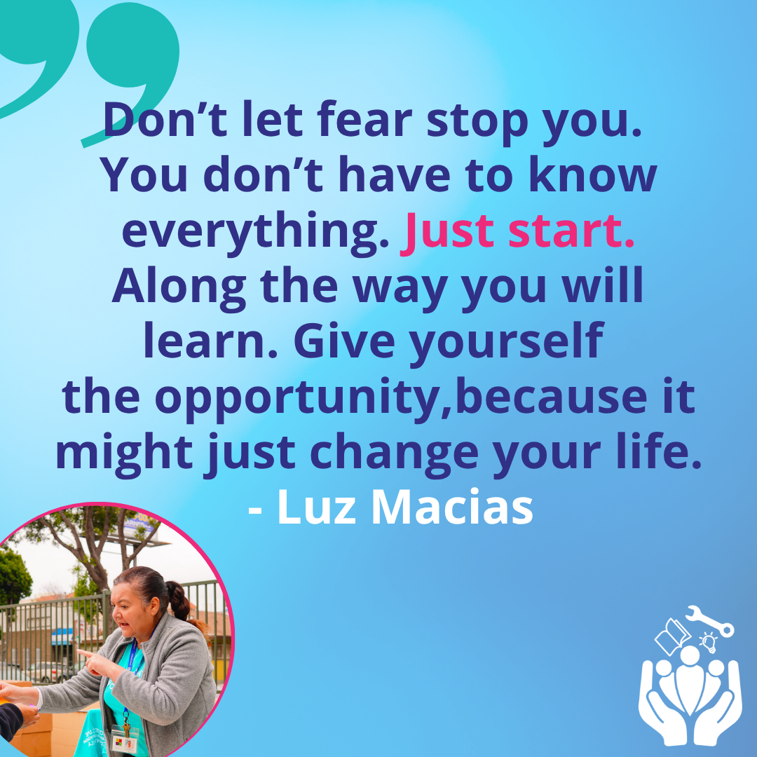 Presentamos a Luz Macias Un día, Luz caminaba con su hija hacia la escuela cuando vio un volante para una reunión en la escuela. Por curiosidad, decidió asistir a la reunión. En ese momento no podía imaginar que esta sencilla decisión le llevaría a la trayectoria de convertirse en una líder comunitaria. En ese entonces, ella no trabajaba, nunca había usado correo electrónico y no se veía como líder - y Luz pensó, “Tengo tiempo. Soy mamá. Debo ver de qué se trata”. Al entrar a la reunión, recibió la bienvenida de Blanca Valdez, a quién le dio su nombre y número de teléfono. Esta simple decisión abrió muchas puertas para Luz, al hacerse parte de lo que ahora se conoce como la Colectiva de Transformación Comunitaria de Best Start Metro LA (BSMLA).